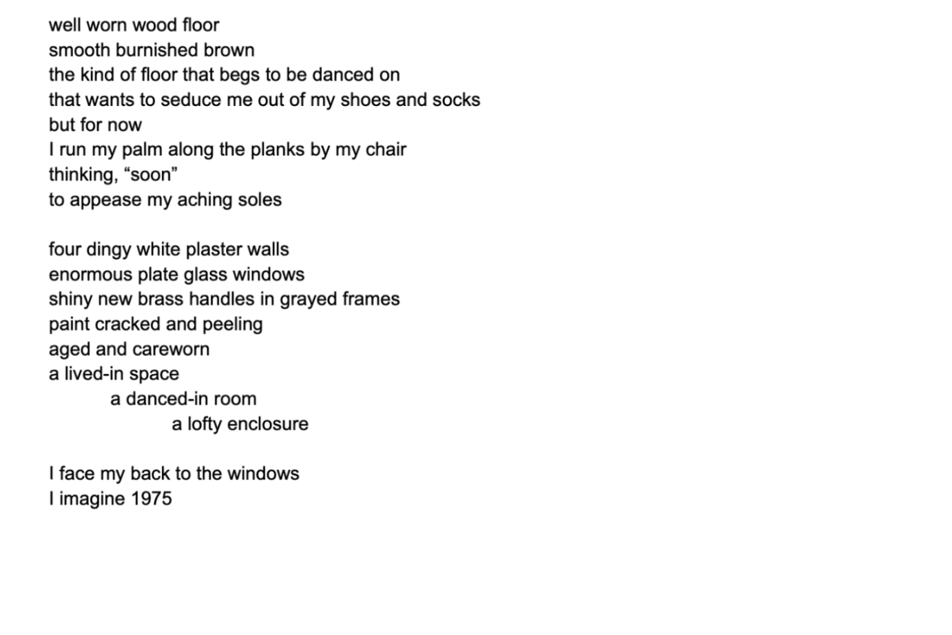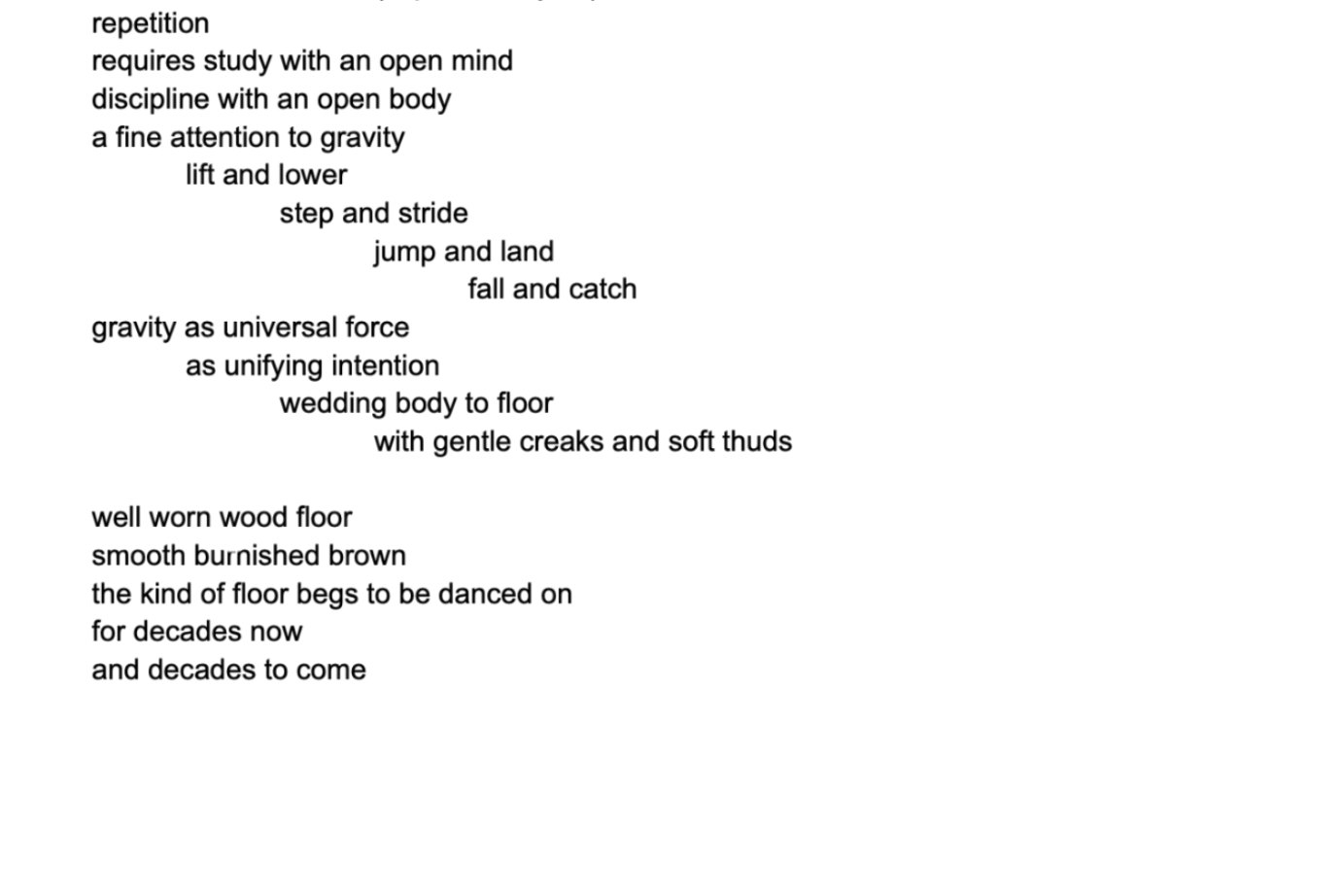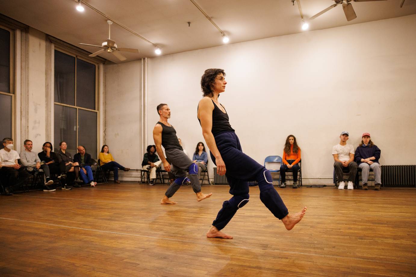 All this pre-show research put me in a reflective mood as I wove through dense Soho crowds on a crisp fall evening. I was grateful to enter a brief reprieve in the loft — a suspension of time in a space of artistic sanctuary that offered both transportive focus and imaginative flight. A notorious early bird, I found myself scribbling in my notebook as the loft slowly filled with audience members bundled by elevator in batches to disperse among the metal folding chairs lining the four walls. As we quieted into observant collectivity, the space’s intimacy and exposure prompted me to put away my notebook and be with the dance.