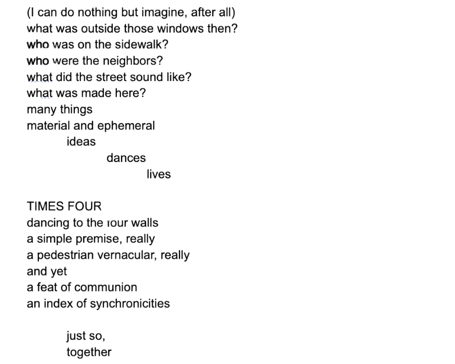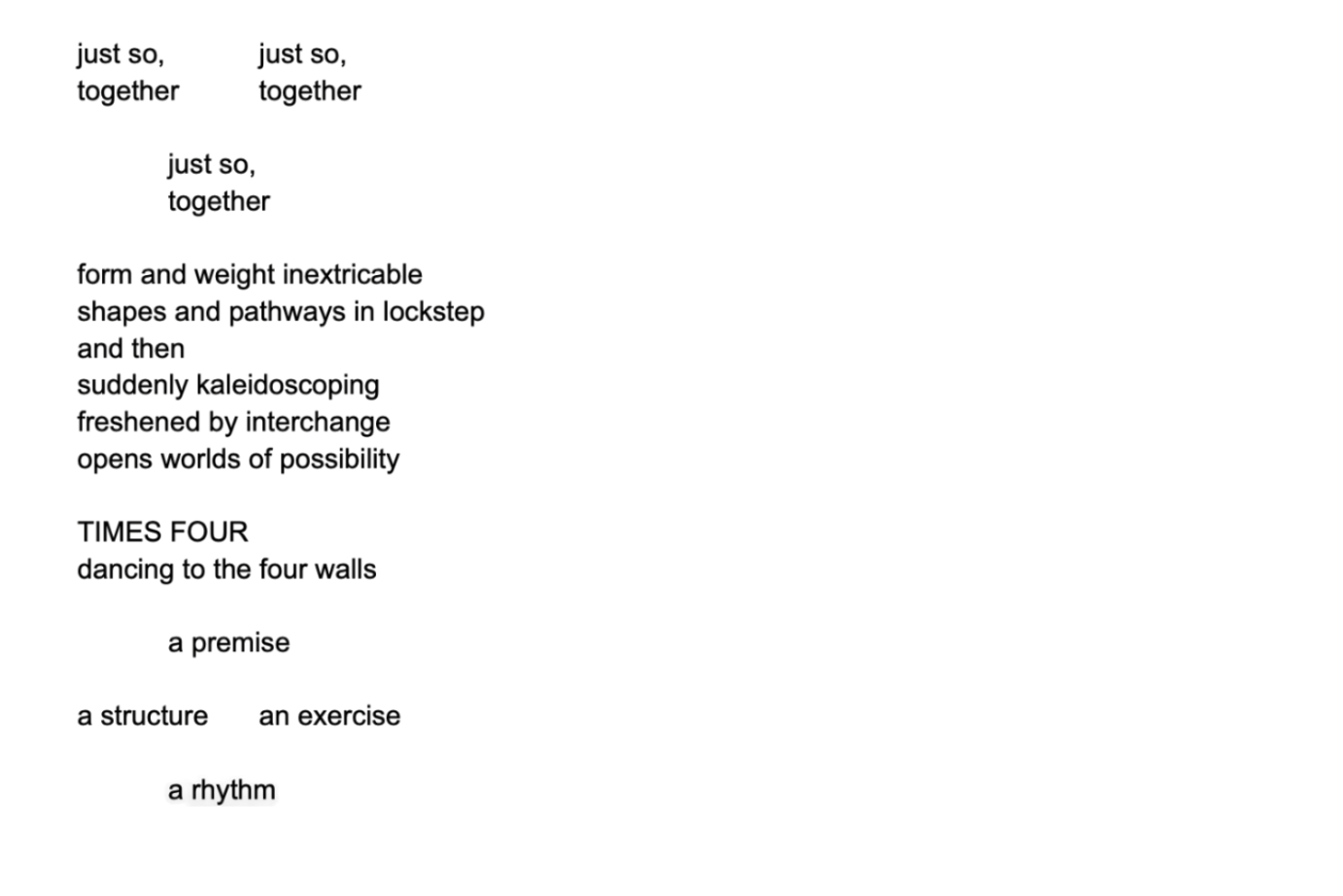 Writing about the work, spanning 1976 to 1980, includes keenly observant and insightful pieces by Sally Banes, Jennifer Dunning, Deborah Jowitt, Wendy Perron, and Marcia B Siegel, as well as an interview with Nancy Stark Smith — copious and storied discourse, both then and now. Decades on, Gia Kourlas contextualizes the historical work, the artists, the space, and the process behind the contemporary rendition of TIMES FOUR in a reflective New York Times feature. All of the above are highly recommended reading for viewers of this dance and dance history nerds alike, though the steps themselves and the bodies performing them speak volumes of their own accord.