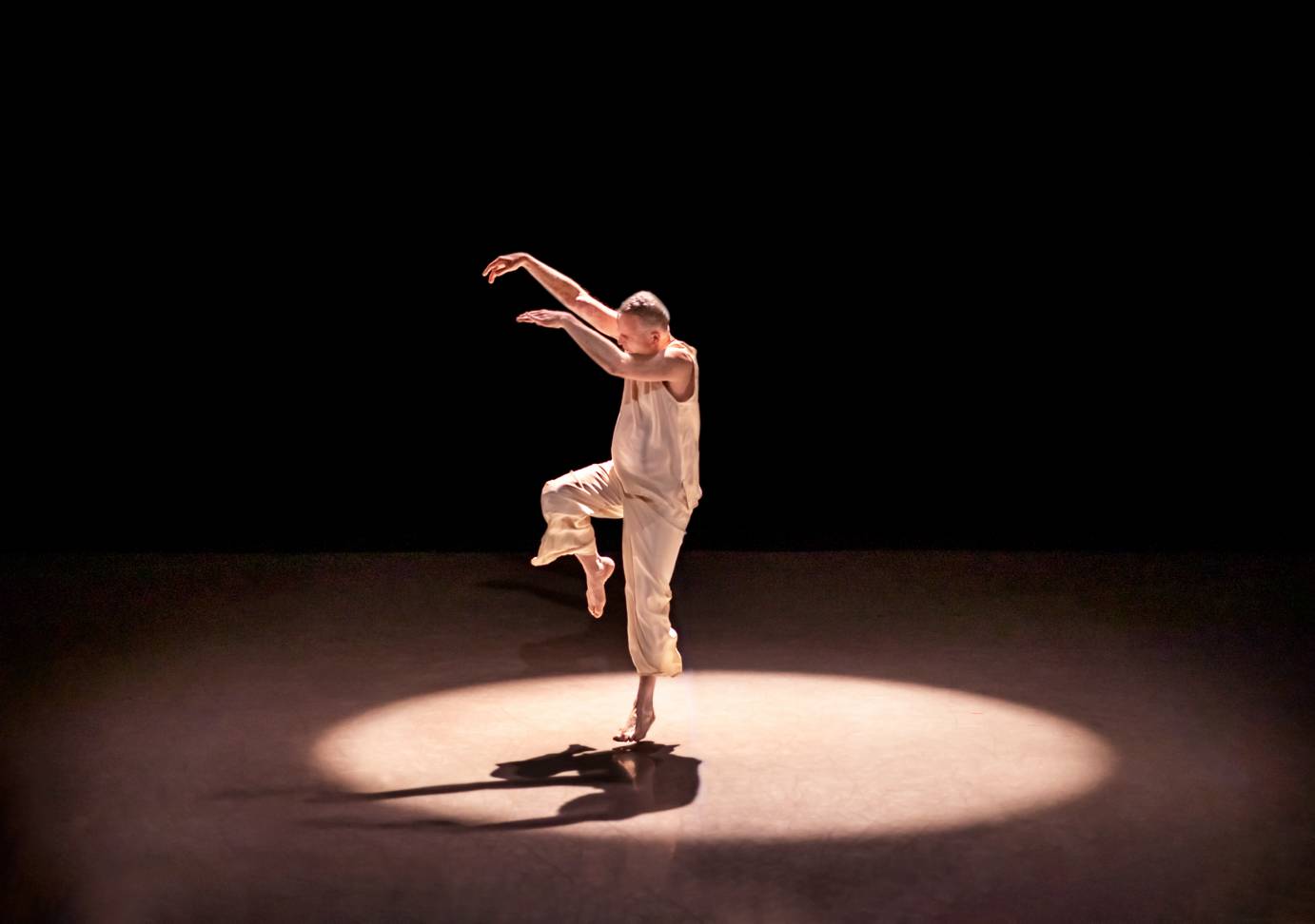 Moved by the pulse of Balkan folk music, Amos Pinhasi spirals in a spotlight, in Accordion. Arms overhead, he articulates each finger while stepping in time to the percussive beat. As the music builds, it lifts him into joyful skips. Although contained in his body, Pinhasi’s dance feels rooted in tradition, channeling a vast communal energy well beyond himself.