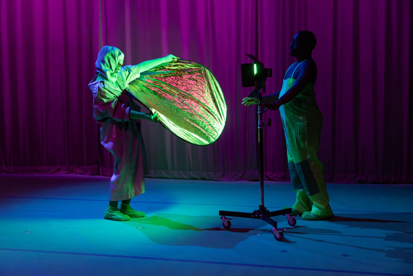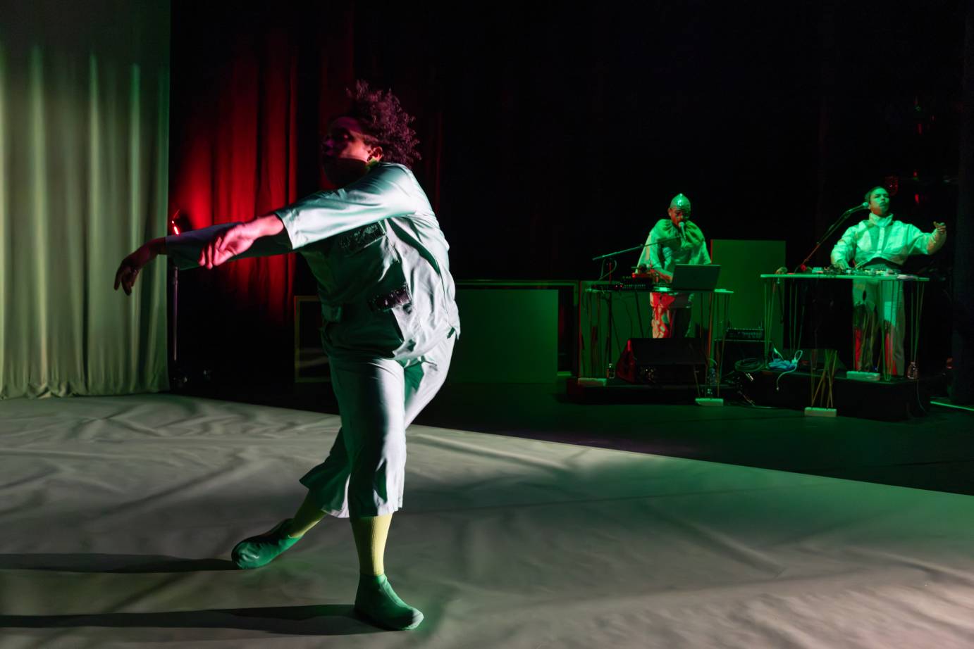 Green saturates the space, living in costumes, panels, and a massive chroma-green backdrop gesturing toward disappearance and hyper-visibility. Mobile lights douse the stage in emerald. A chandelier glints above, while a disco ball hovers over sound equipment that Toussaint-Baptiste and Holland Andrews soon wield for live layering. The performers’ slow-motion swell into full-bodied movement. They cart lights across the stage, continually rearranging their panels. A stormy mood brews as one performer narrates: “Exterior: the air gets damp. Interior: rain begins to fall.”