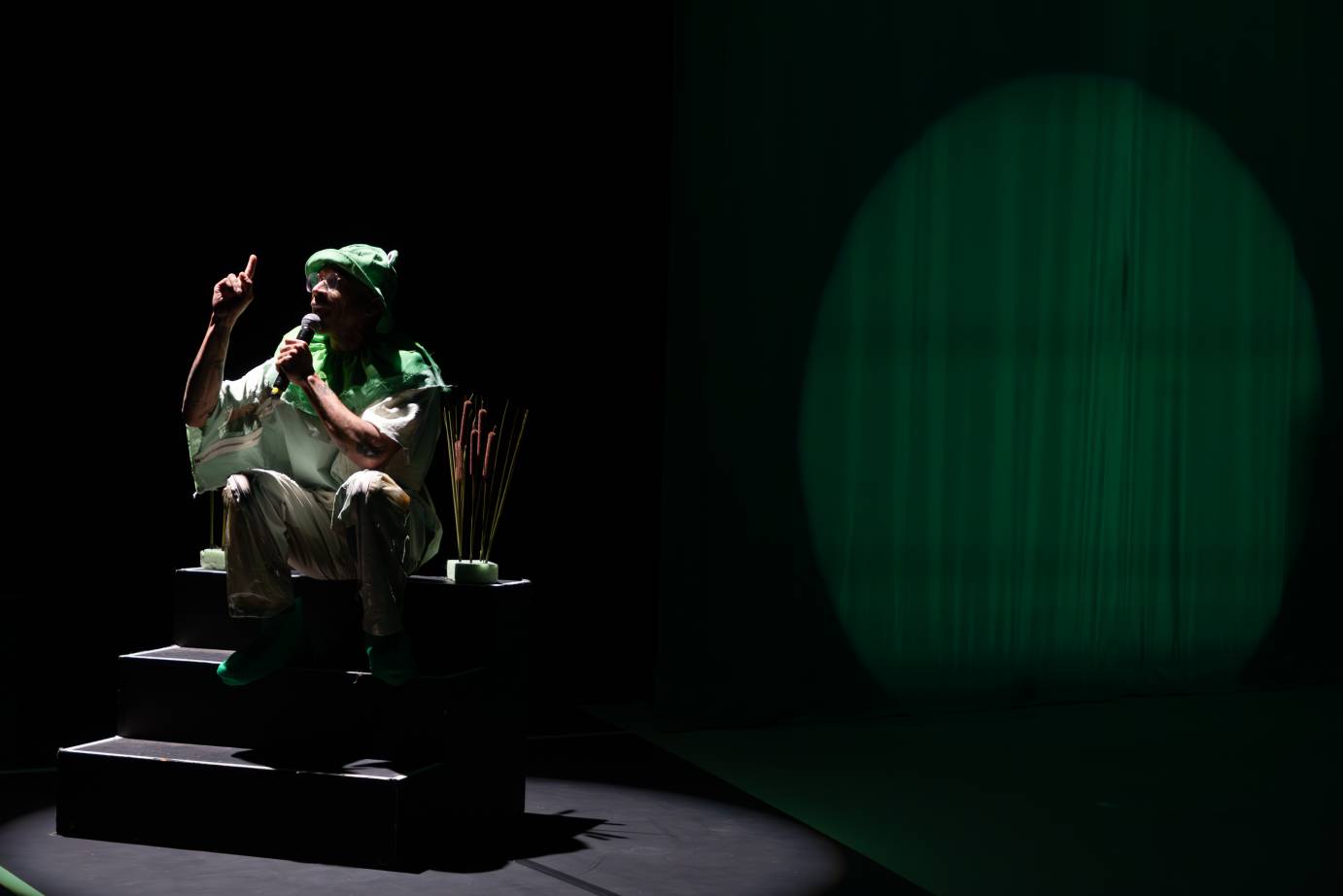 A surreal climax arrives when Toussaint-Baptiste dons a frog hat, channeling Kermit the Frog. The bit lands humorously yet heavily, swelling into a shimmering rendition of “It’s Not Easy Being Green,” sung with haunting resonance by Andrews. As Andrews sings, Katrina Reid circles the space with slow, floating movement, carrying a reflective silver disc that anchors the scene.