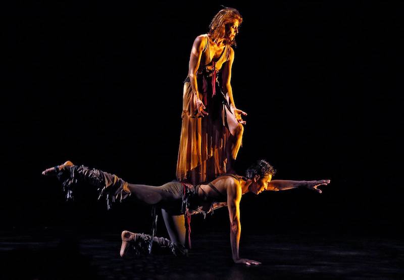 The dramatic highlight of the evening, Buglisi’s 1991 duet Threshold, pays tribute to the choreographer’s larger-than-life mentor, Martha Graham. Extravagantly conceived, and performed with wonderful subtlety and intensity by Virginie Mécène and Kevin Predmore, Threshold begins with the sight of a woman’s apparently naked body struggling to free itself from a cocoon. Her face presses darkly against the fabric enclosing her, and then retreats. Then her hands rise through an opening clutching something that turns out to be her own entrails.