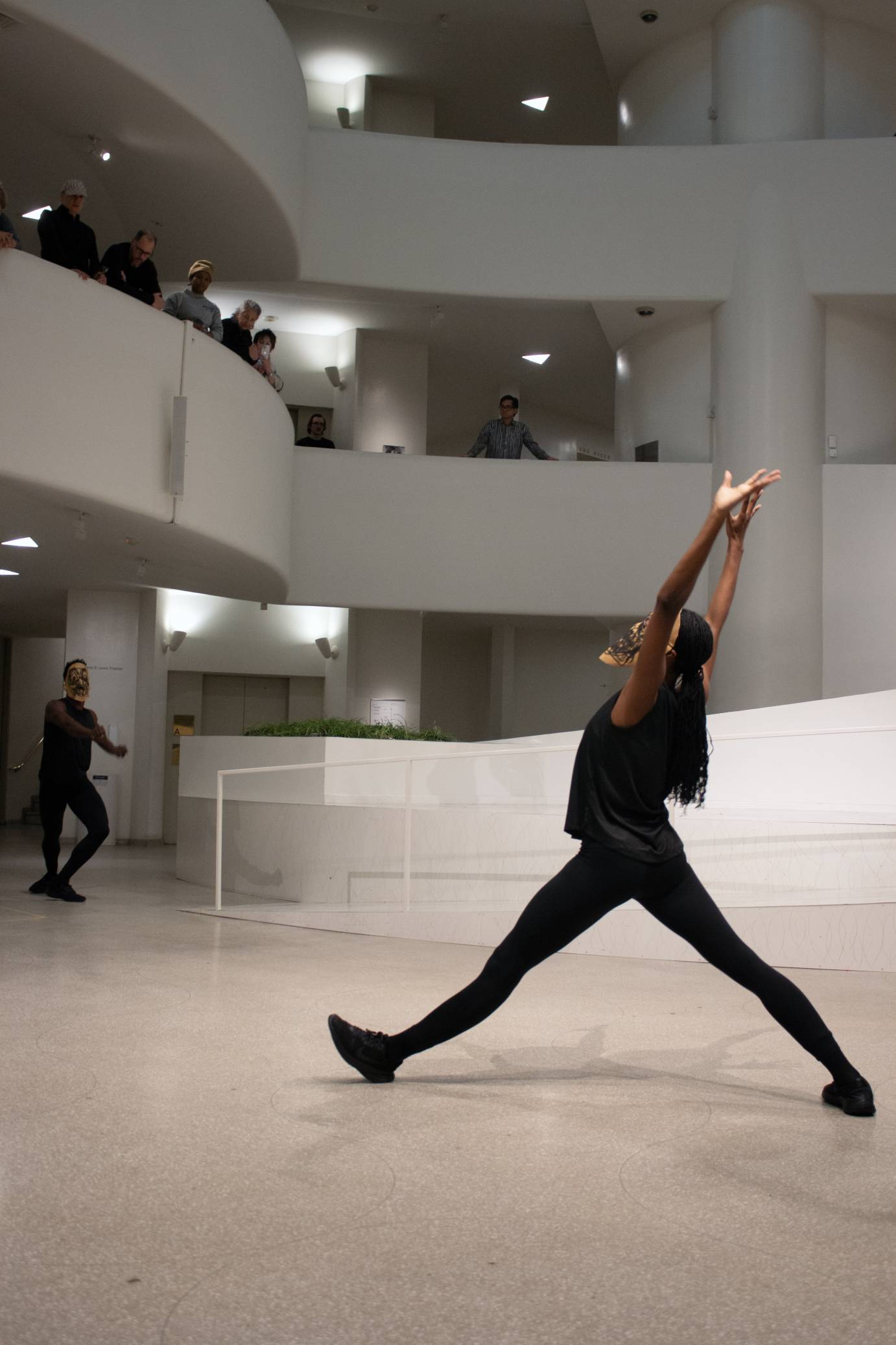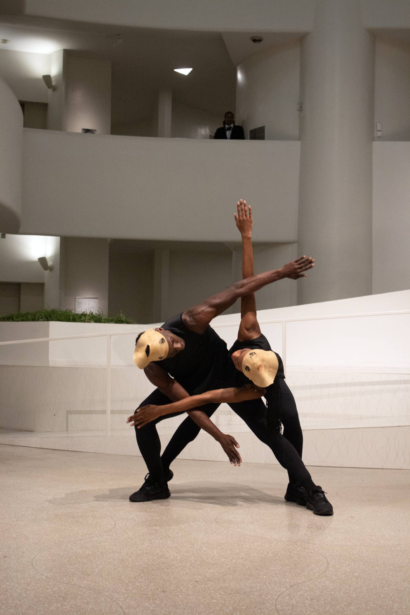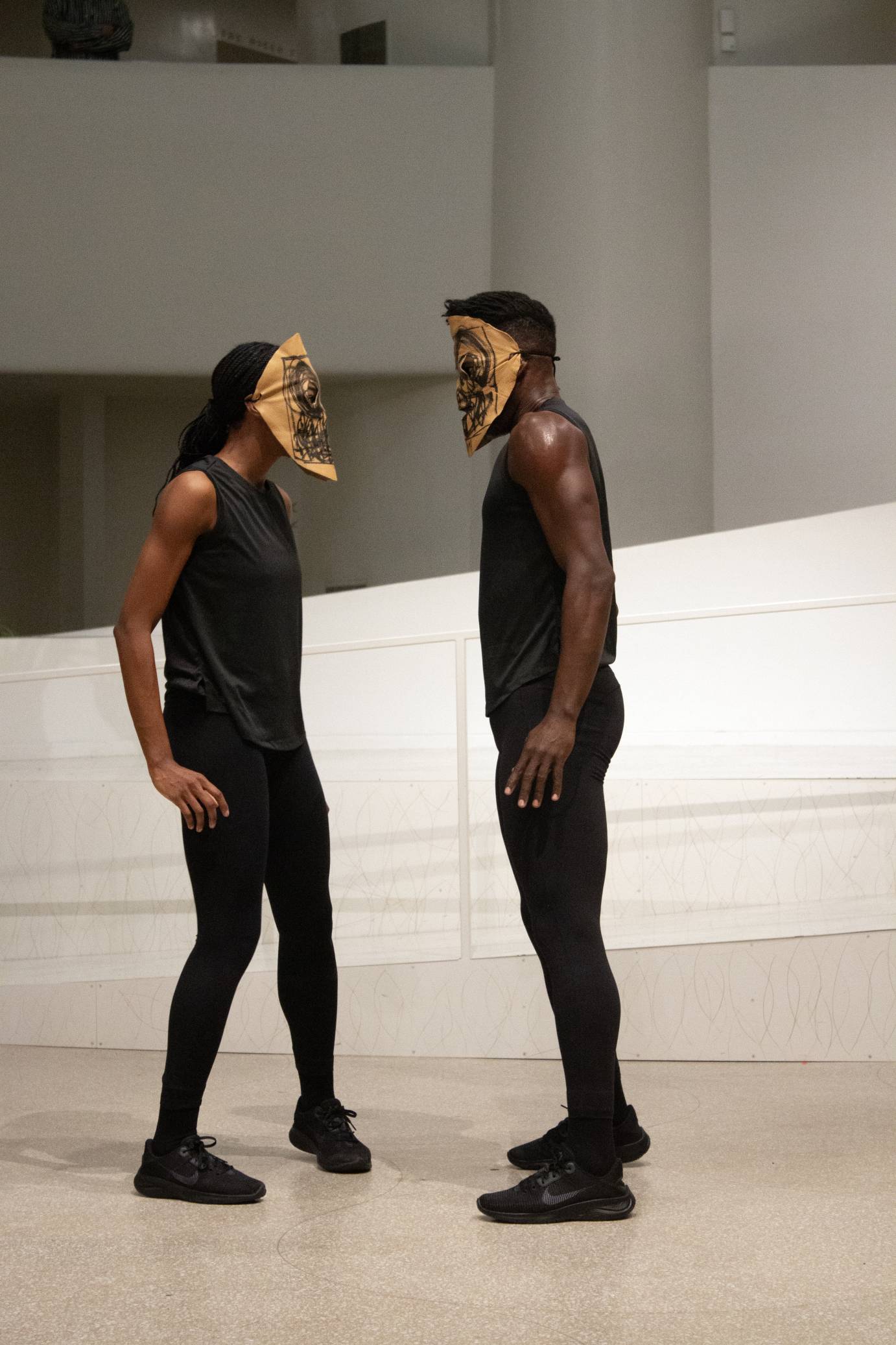 We are invited to view the performance from anywhere in the rotunda—half the crowd gathers at the entrance on ground level, while the remaining half settles on the upper floors. Knight and Williams shatter the initial stillness, lunging into view. Knight approaches from the second level of the museum’s spiraling rotunda, as though descending a mountain. As he strides, his torso and arms undulate, rippling in a steady, measured rhythm. Williams carves through space on the rotunda’s floor, her movements resonant and regal. Both wear tan masks that cover their faces entirely; black markings encircle their masks’ eyes, noses, and mouths. Below the neck, they don fitted black tank tops, pants, and sneakers. With their facial expressions hidden, I hone in on their movement qualities as they merge the meter of hikers with the spontaneity of artists.