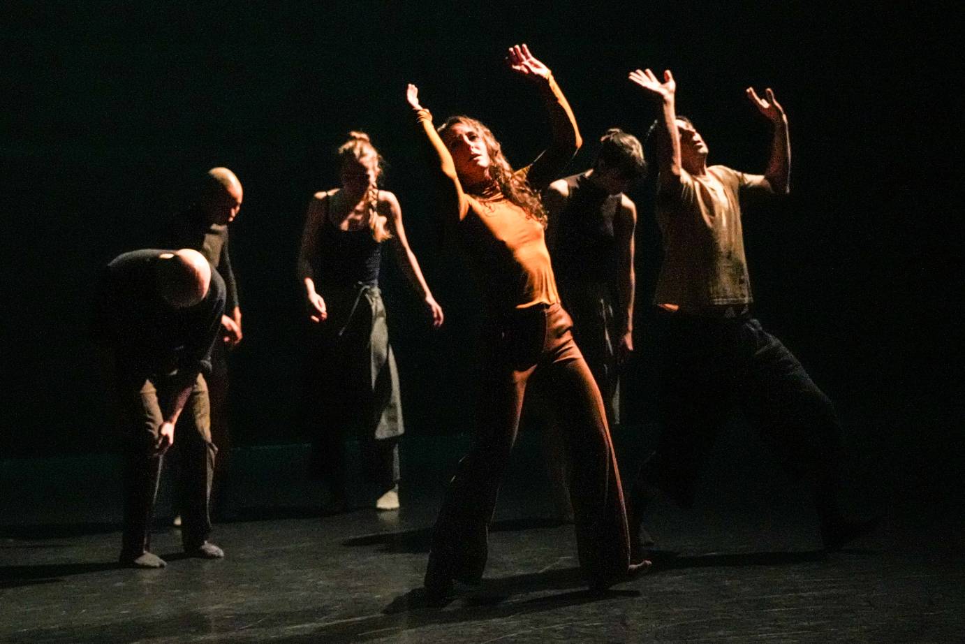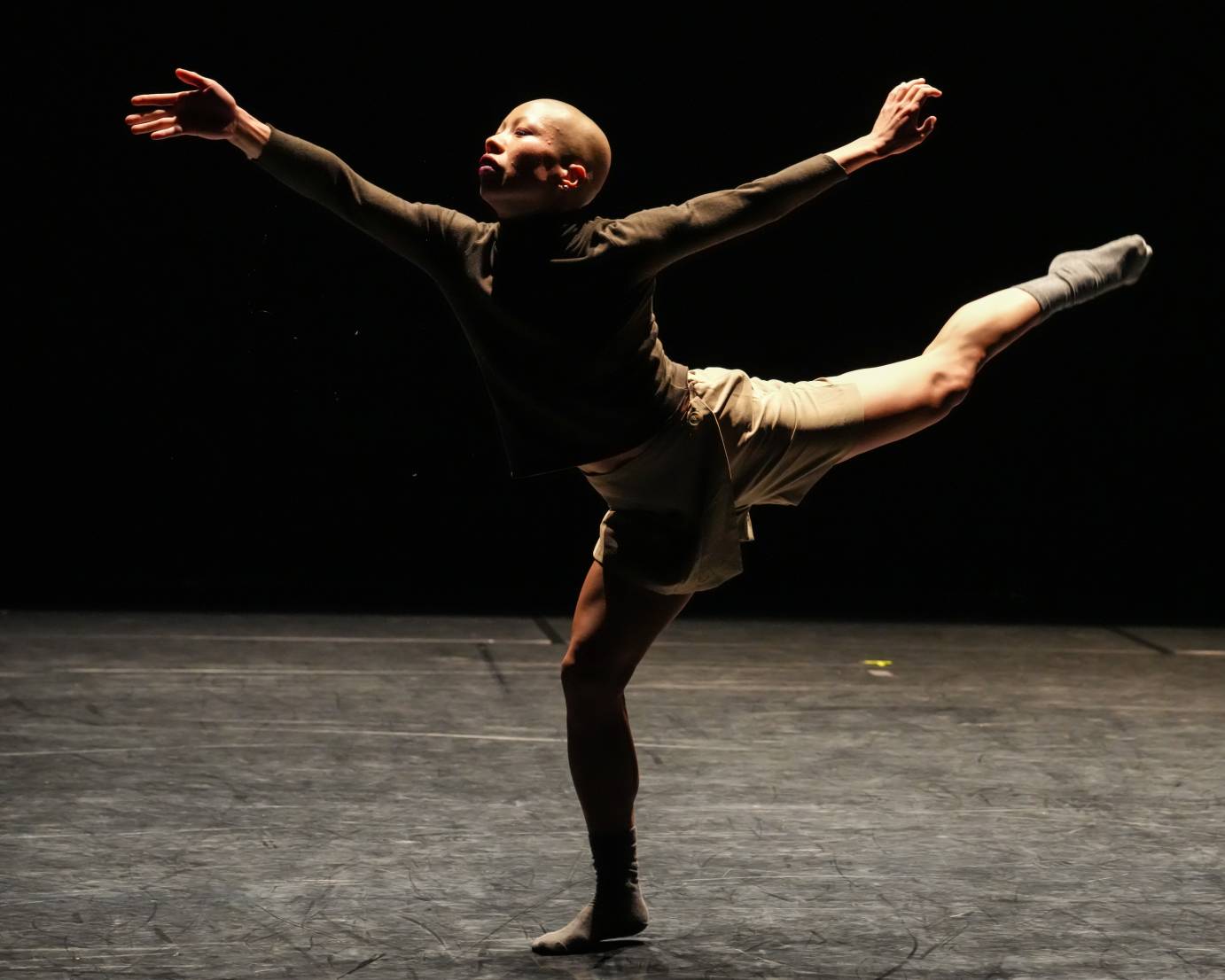 A shift in texture and percussive tone arrives with Colin Heininger, whose movement marries raw, kinetic attack with control. As he concludes his movement phrase, he turns toward the audience, slowly drawing his arms inward as if pulling his energy back into himself. This creates a moment of quiet tension and introspection.