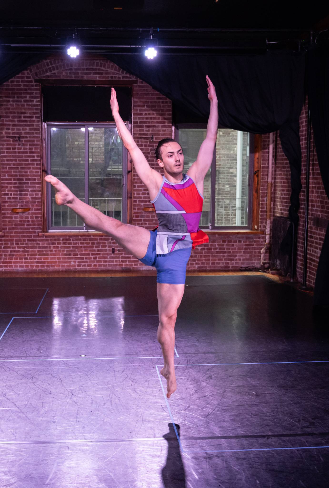 Fists punch the air while running in place to Jerome Begin's distinctive beat and techie high-pitch sound. Deep pliés contrast with large jetés that cover the small space. The fingers count, run over an ear or up a leg as if shaving, wriggle down the sides of the body as if smoothing clothing, scrutinize fingernails, or form the hands into O’s over both eyes like binoculars. Unison trios and duets are observed by dancers who lounge in the stage right and upstage windows changing positions to slink on the casements. A recorded cough, clearing of the throat, and a laugh remind us of a human presence, interspersed with static thrumming and birdlike trills put through a synthesizer. The exposed brick and lack of curtains or sets lends an air of orthogonal urbanity, along with the bright, Mondrian inspired color-block costume tops and shorts hugging the dancers’ sleek bodies. One beautiful movement has Donahue clasping Straney’s forearm as they both plié before he pulls her hard and one leg flies behind and around her as if an afterthought. Repeated several times, the duet revolves in a circle before the dancers depart.